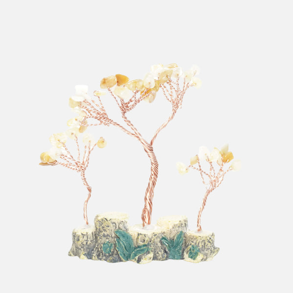 Make a bold statement of prosperity with this Citrine Crystal Tree on a polished wooden base. Brilliant citrine gemstones are artfully arranged as leaves on sturdy copper branches, all mounted on a natural wood slab that enhances its earthy elegance. Citrine, the famed merchant’s stone, is celebrated for attracting abundance, success, and positive energy. As this tree’s leaves, the golden crystals radiate joy and optimism, uplifting the ambiance of any room. The solid wooden base provides a stable foundation and adds a touch of rustic charm, making this piece stand out as larger and more substantial than typical mini crystal trees. It serves as a stunning centerpiece for a coffee table, office shelf, or meditation space, continuously infusing your environment with warm, sunny vibes. Display it to manifest prosperity, enhance creativity, and brighten your decor with natural beauty. Handcrafted with genuine crystals and quality materials, this tree merges home décor with spiritual intention—a perfect focal point for your space or a memorable gift of positivity and fortune.