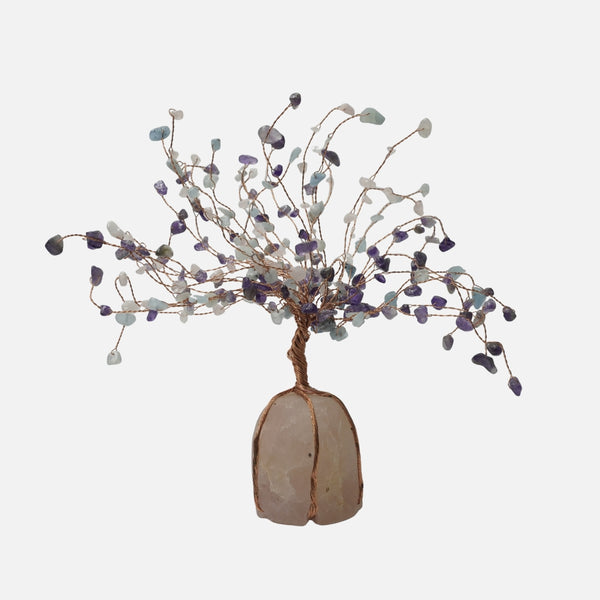 Experience a beautiful fusion of energies with our Multicolour Crystal Tree, gracefully rooted on a solid rose quartz base. Its branches are adorned with a vibrant array of natural quartz gemstones, each representing different healing vibrations. The substantial rose quartz base infuses the entire piece with unconditional love and compassion, creating a truly harmonious blend. This unique combination promotes overall well-being and heart-centered positive energy. The gentle pink of the rose quartz beautifully complements the rainbow-like tree, symbolizing how love underpins all aspects of life. Making it a captivating decor accent for any room or altar that needs both balanced and loving vibes. Place it in a living area or bedroom to harmonize the environment and uplift the emotional atmosphere. Handcrafted and one-of-a-kind, this crystal tree on its rose quartz foundation is not just visually striking but also spiritually nurturing—a wonderful gift of affection and unity for yourself or someone dear.