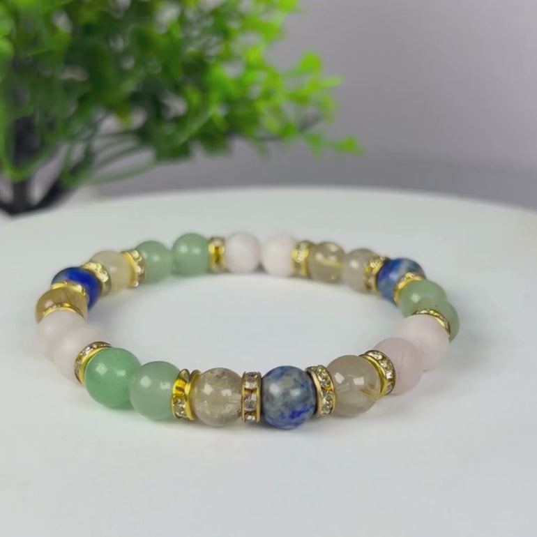 Thoughtfully crafted using a harmonious blend of Lapis Lazuli, Golden Rutile, Rose Quartz, and Green Aventurine, this bracelet supports clarity of thought, heartfelt connections, and steady forward movement in life. Each bead is chosen not just for its beauty, but for the intention it holds within the sacred mandala form.